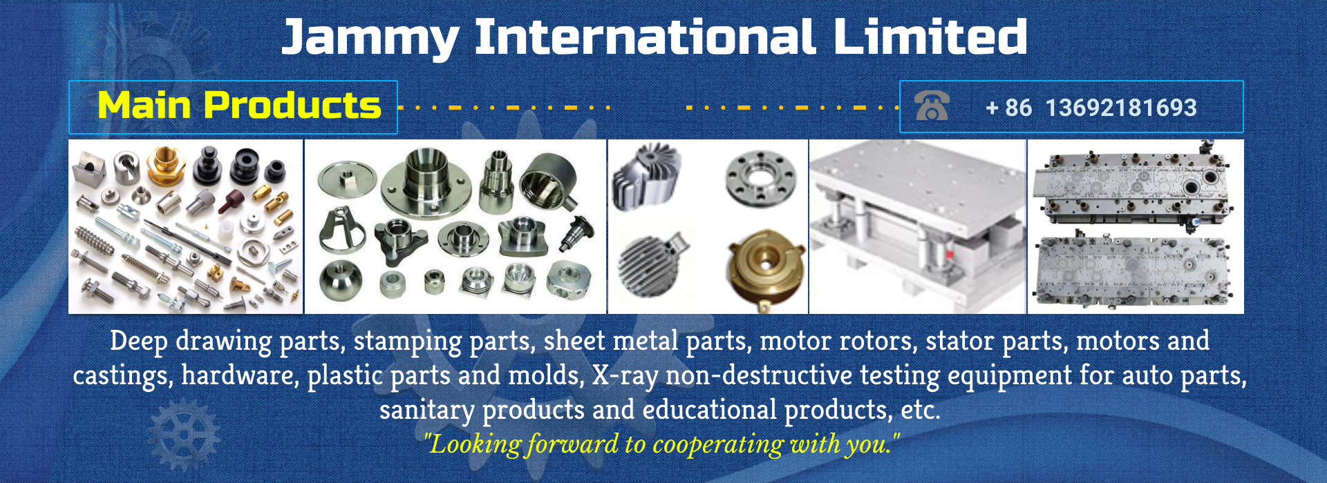 Jammy's main products include: deep drawing parts, stamping parts, sheet metal parts, motor rotors, stator parts, motors and castings, hardware, plastic parts and molds, X-ray non-destructive testing equipment for auto parts, sanitary products and educational products. The end customers of the products include: Bosch, BMW, Volkswagen, Ford, Renault, DAF, Nissan, Mitsubishi, Daewoo, Sinotruk-Howo, Delong, DJ, Huawei, ZTE, etc.